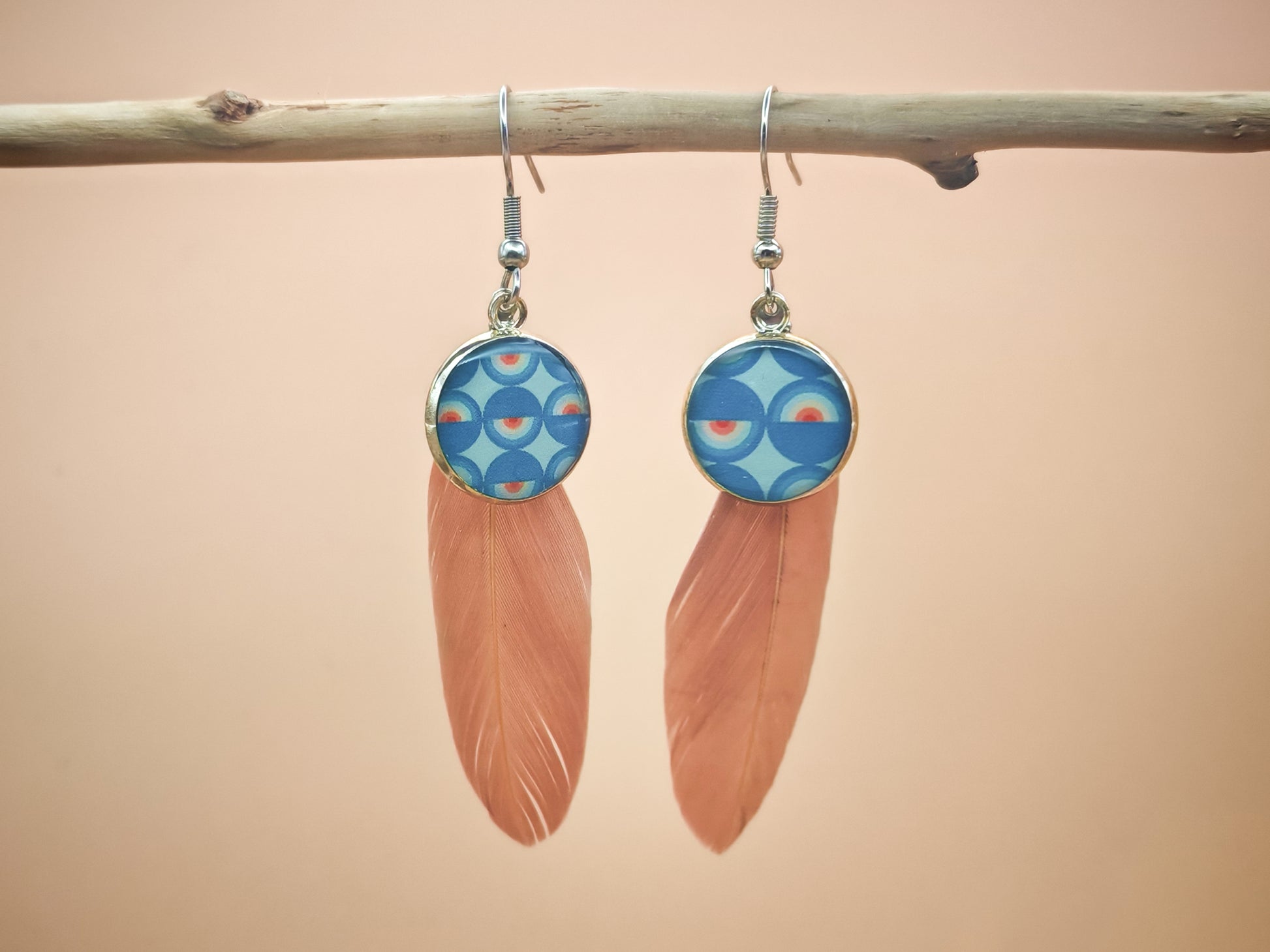 Un vent vintage souffle sur cette paire de boucles d’oreilles pendantes, mêlant l’élégance des formes géométriques rétro à la douceur naturelle d’une plume. L'accroche est en acier inoxydable. Le cabochon rond de couleur argenté de 14 mm arbore un motif aux cercles bleus et turquoise, ponctués d’un soupçon de corail, dans une esthétique résolument inspirée des années 70.