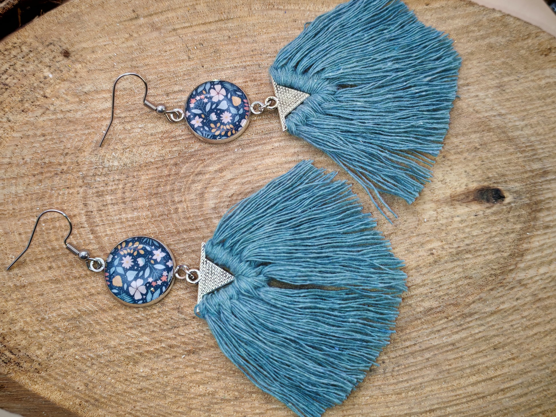 Ces boucles d’oreilles associent un cabochon rond de 16 mm aux délicates fleurs aux teintes bleu nuit, rose poudré et touches dorées, à une pampille en macramé bleu canard aux longues franges souples.