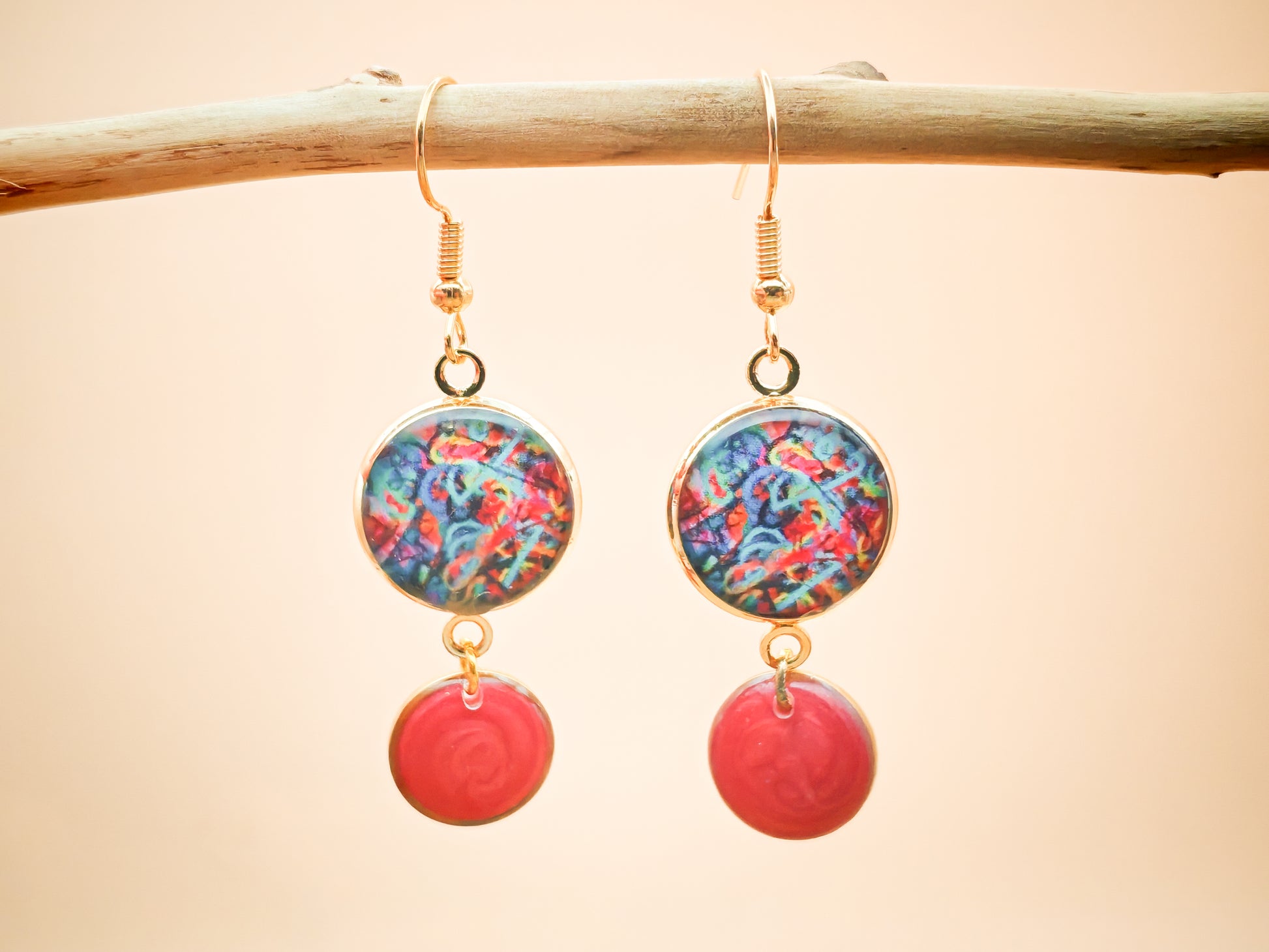 Offrez à vos oreilles une œuvre d’art miniature. Ces boucles d’oreilles mettent en valeur un cabochon rond de 14 mm à motif abstrait, mêlant des éclats de rouge, bleu, violet et orange sur fond sombre, tel un tourbillon de pinceaux. En dessous, une pampille ronde en résine rouge, délicatement marbrée, complète l’ensemble avec éclat.