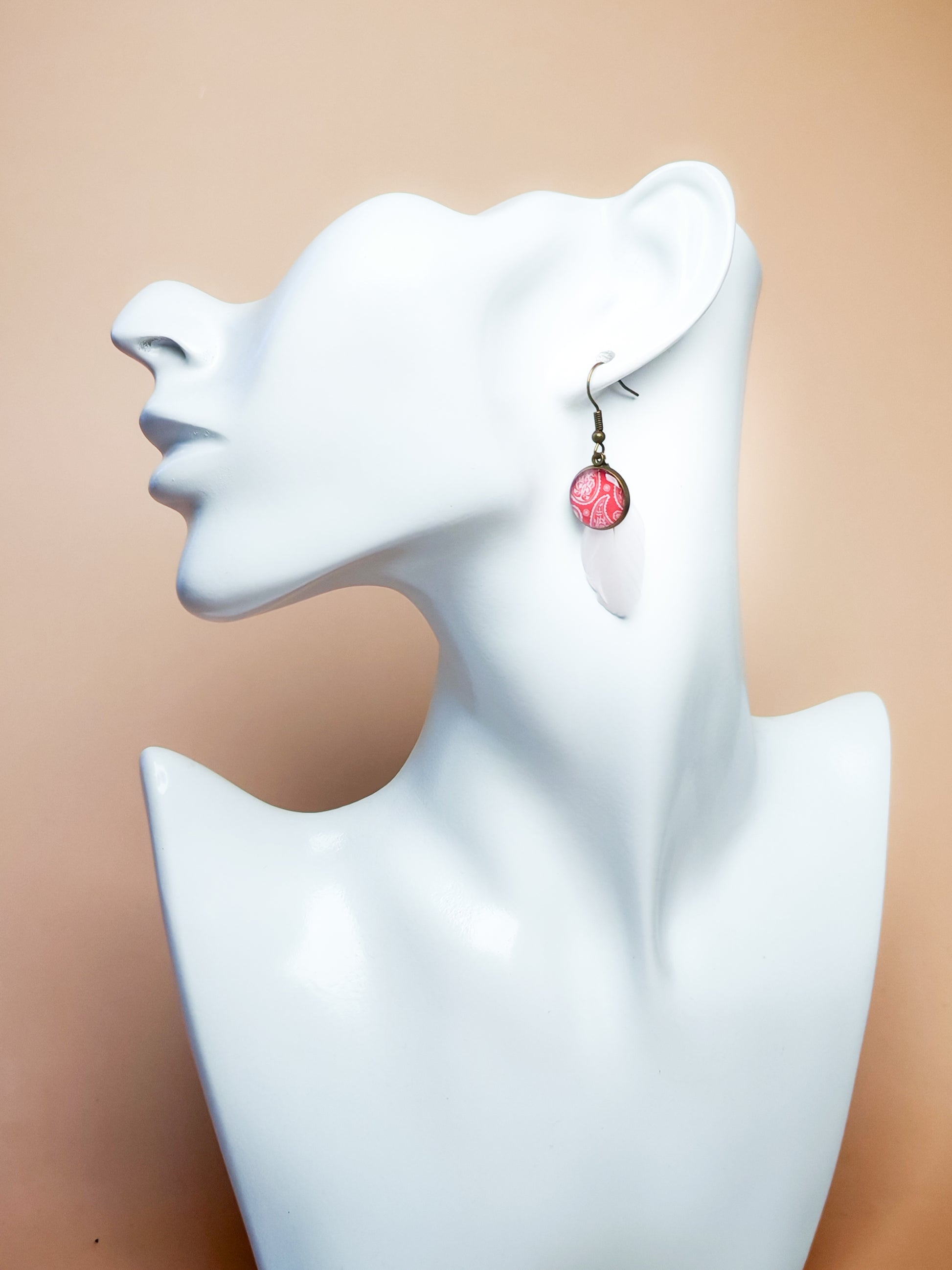 Douces et aériennes, ces boucles d’oreilles marient l’éclat d’un cabochon rose aux motifs délicats et la légèreté d’une plume rose pâle. Le cabochon, travaillé à la résine, capte la lumière dans des nuances féminines et raffinées, tandis que la plume, fixée sous le cabochon, apporte une touche bohème et poétique. Les attaches en métal de couleur bronze à l’aspect vieilli complètent l’ensemble avec authenticité. Ces boucles d’oreilles uniques allient charme et légèreté et se portent aussi bien au quotidien que lors d’occasions spéciales.
