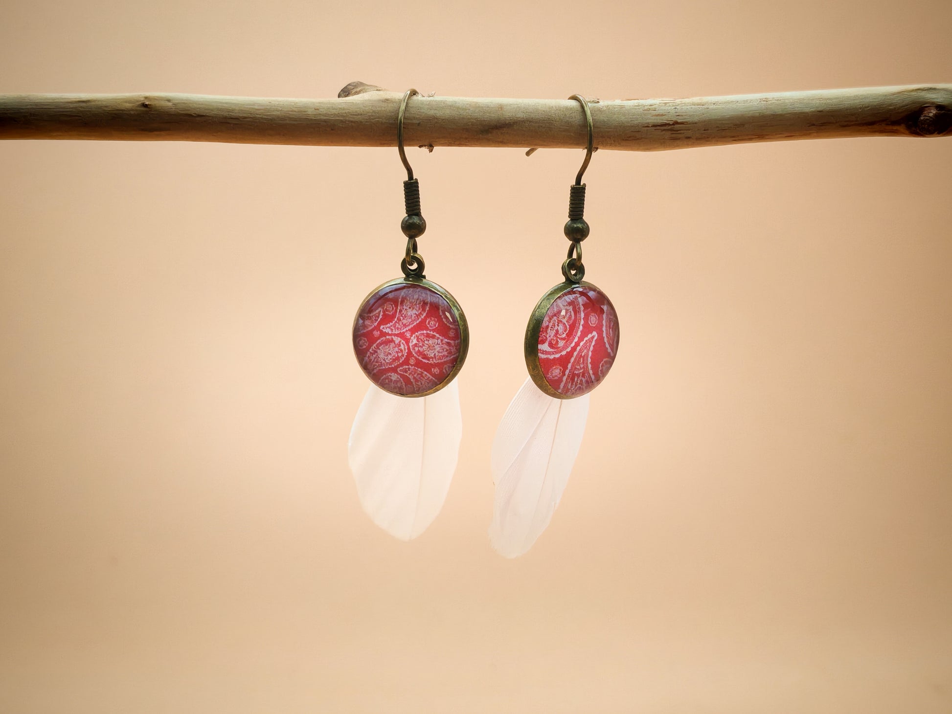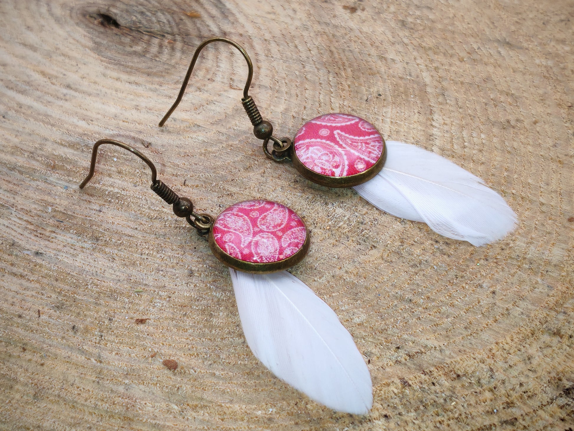 Boucles d’oreilles – Cabochons roses & plumes bohèmes