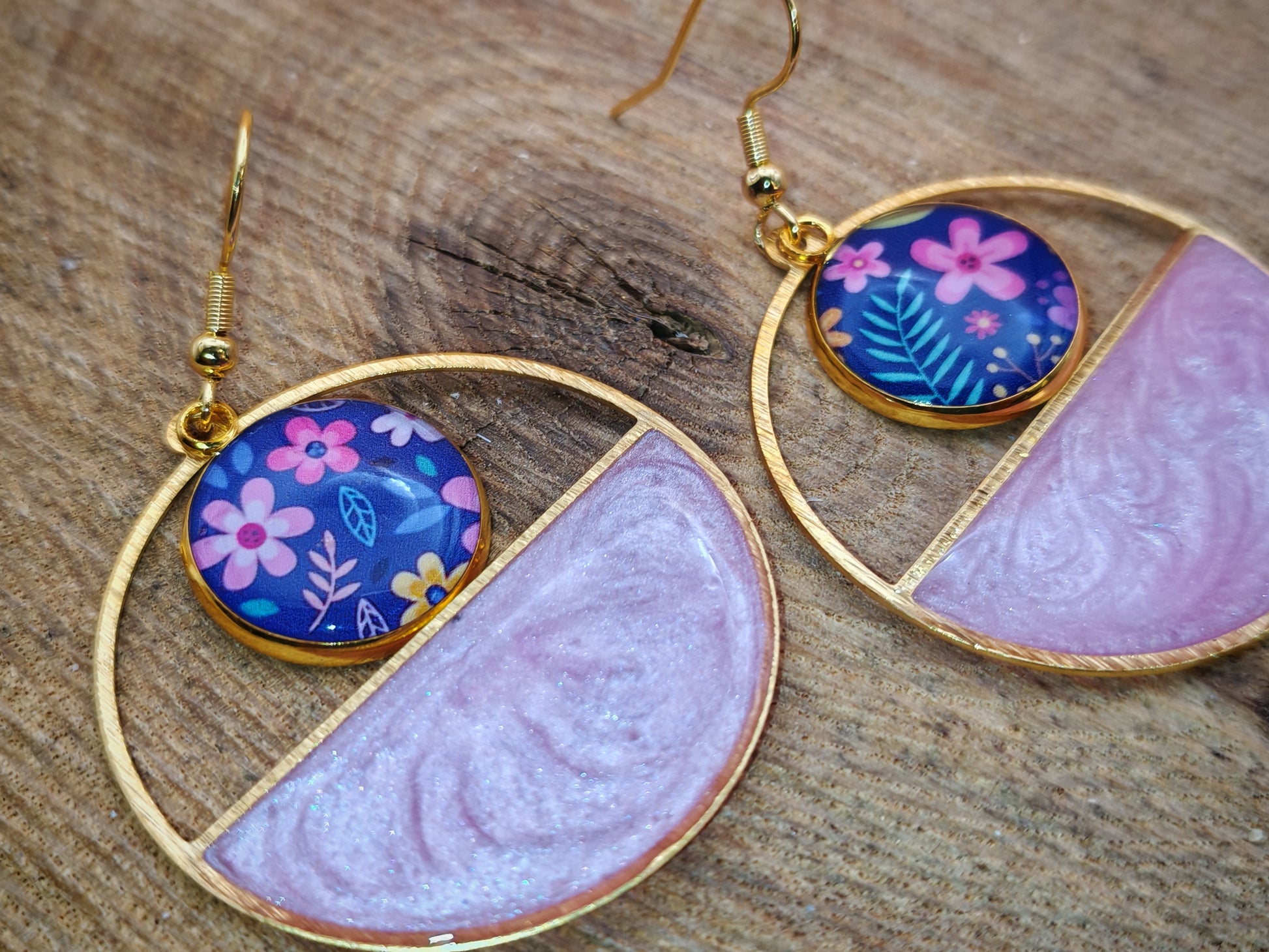 Le cercle ajouré accueille une demi-lune remplie de résine rose aux reflets délicatement marbrés et nacrés, évoquant un ciel pastel traversé de volutes lumineuses.