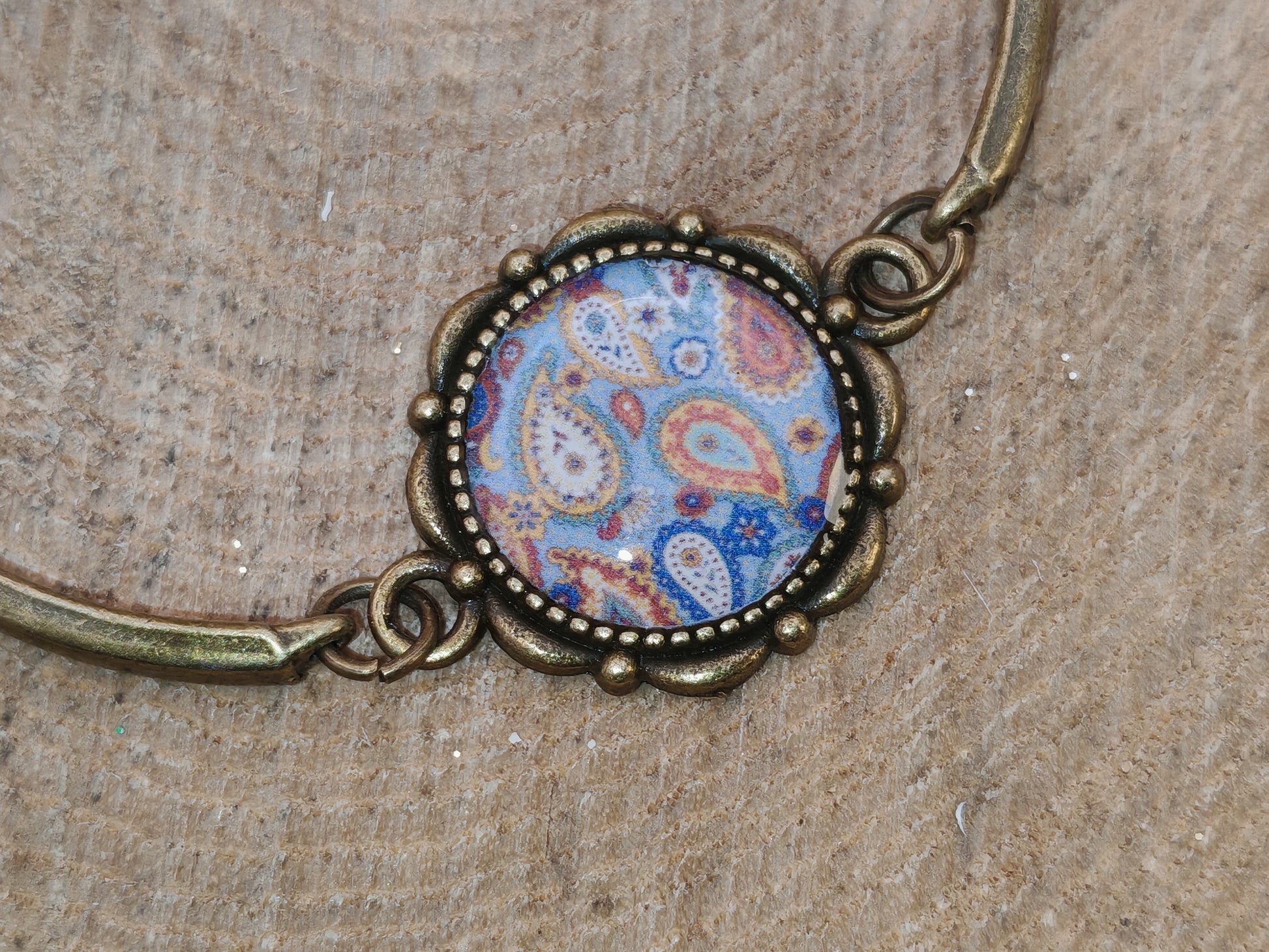 En son centre, un cabochon rond de 16 mm de diamètre révèle un décor d’arabesques aux teintes bleu, écru, ocre et touches chaleureuses, protégé sous résine pour un rendu lumineux et profond. Il est serti dans un support finement travaillé, apportant une note vintage.