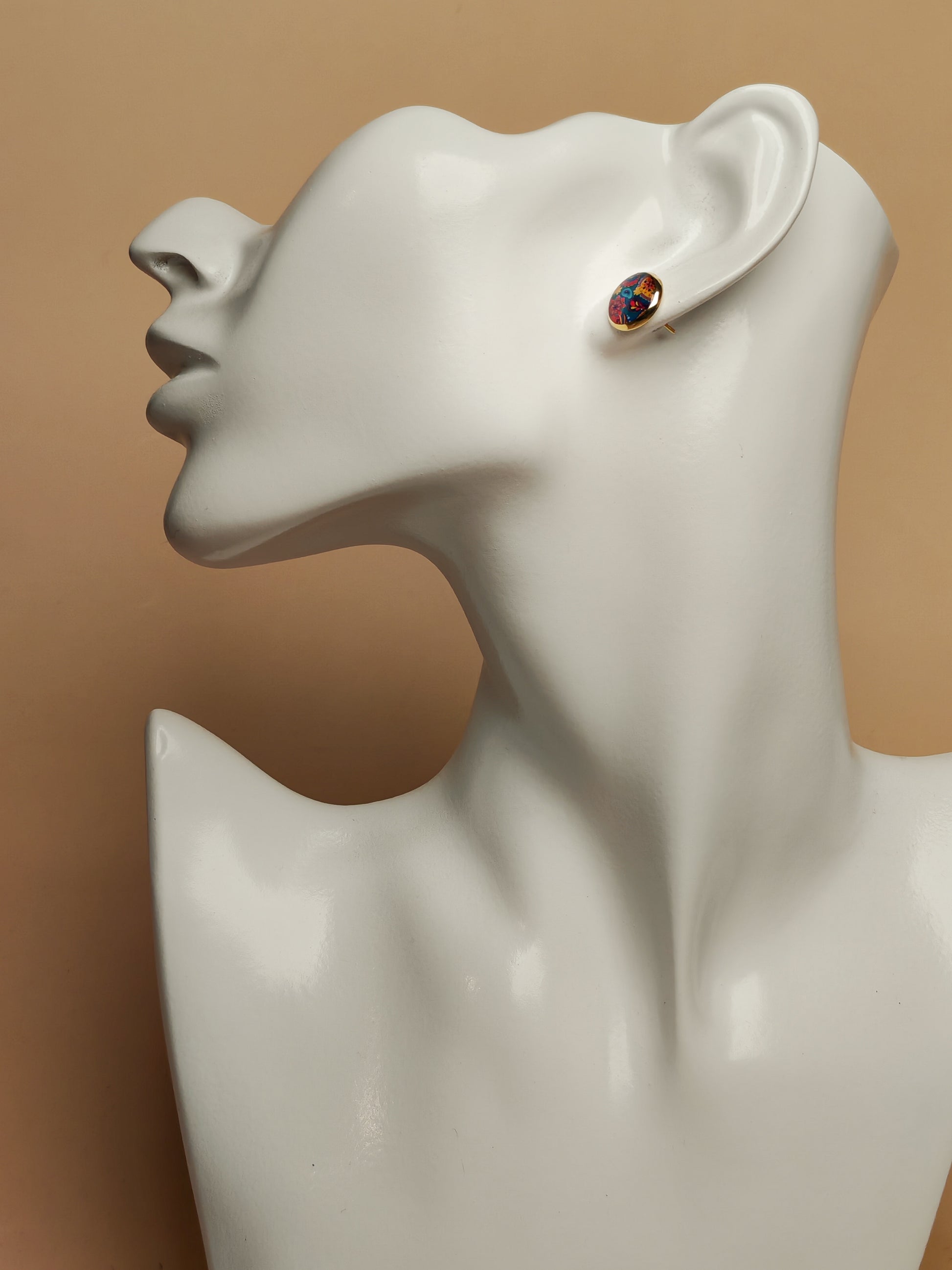 Faits à la main, ces clous cabochon de 10 mm mettent en valeur un motif paisley richement orné, mêlant fleurs stylisées et formes végétales. Les teintes de bleu profond, turquoise, rose, jaune et touches orangées s’entrelacent harmonieusement pour créer une composition lumineuse, expressive et chaleureuse.