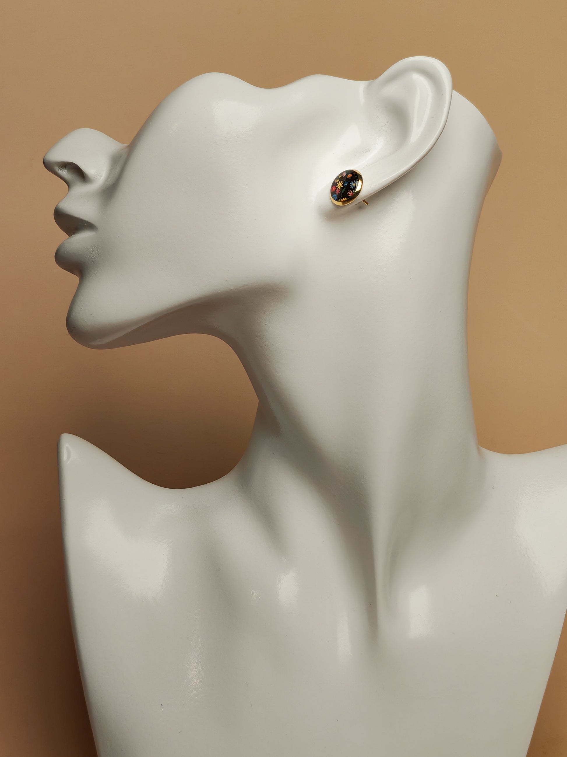 Faits à la main, ces clous cabochon de 10 mm présentent un motif floral délicat et foisonnant, composé de petites fleurs multicolores aux teintes jaune, bleu, rose, vert et touches orangées. L’ensemble se détache sur un fond sombre, créant un contraste élégant qui met en valeur la richesse et la finesse du dessin.