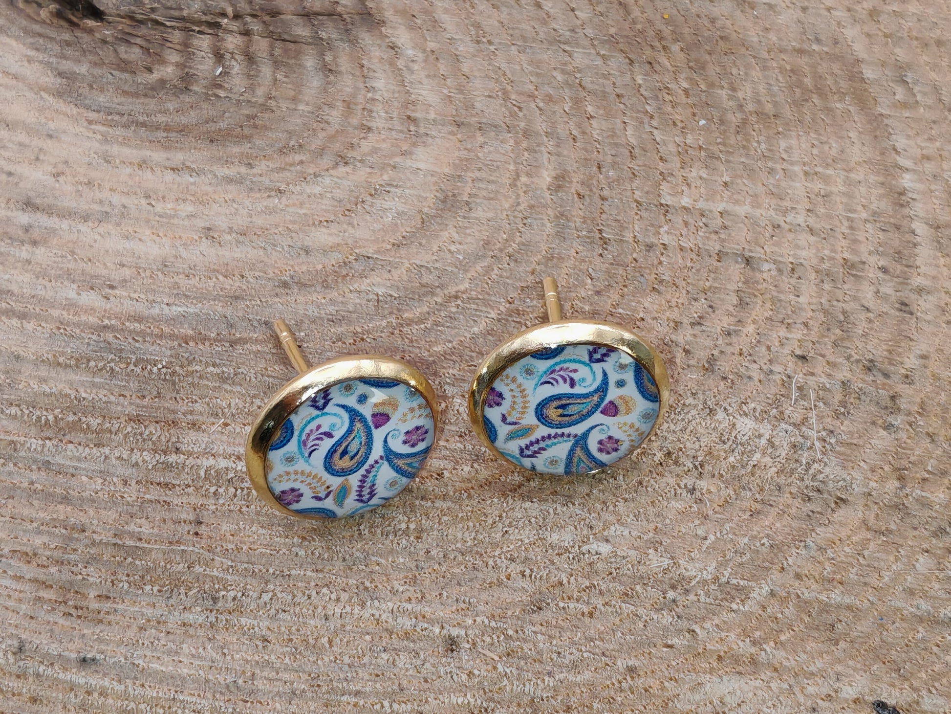 Faits à la main, ces clous cabochon de 10 mm présentent un motif paisley délicat sur fond clair. Les formes courbes aux teintes de bleu, turquoise, mauve et violet sont ponctuées de petits détails dorés, créant un ensemble élégant et harmonieux, à l’inspiration douce et raffinée.