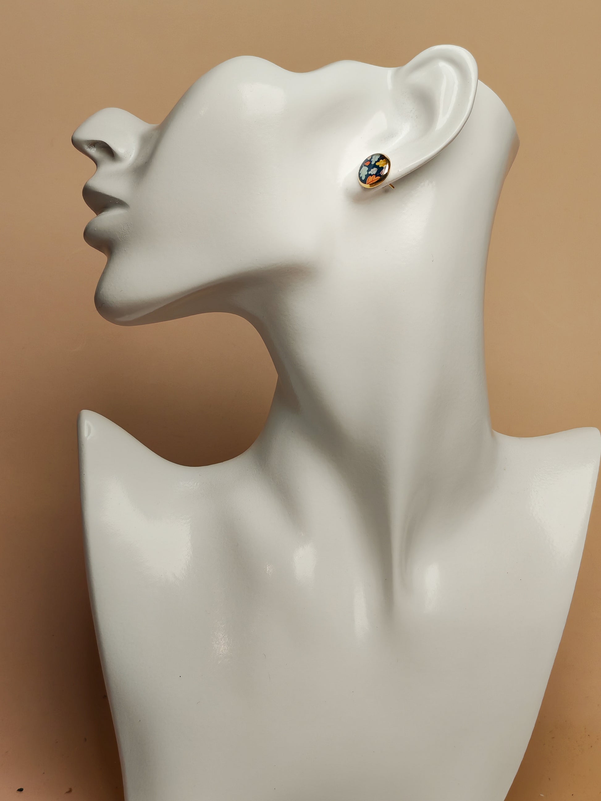 Faits à la main, ces clous cabochon de 10 mm présentent un motif végétal stylisé sur un fond bleu nuit profond. De petites feuilles aux teintes douces et contrastées – jaune, orange, rose, vert d’eau et blanc – se détachent harmonieusement, créant un ensemble à la fois chaleureux et apaisant.