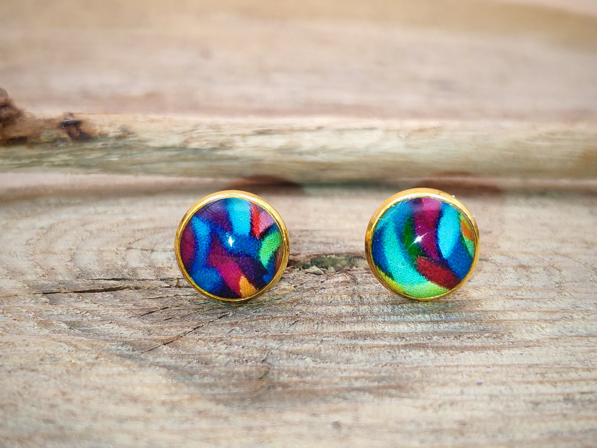 Un tourbillon de couleurs vives et dynamiques s’invite au creux de l’oreille : jaune citron, bleu électrique, fuchsia, turquoise et orange brûlé fusionnent dans un mouvement joyeux et audacieux. Le cabochon en résine révèle toute l’intensité de ce motif abstrait, sublimé par un support en métal doré éclatant.