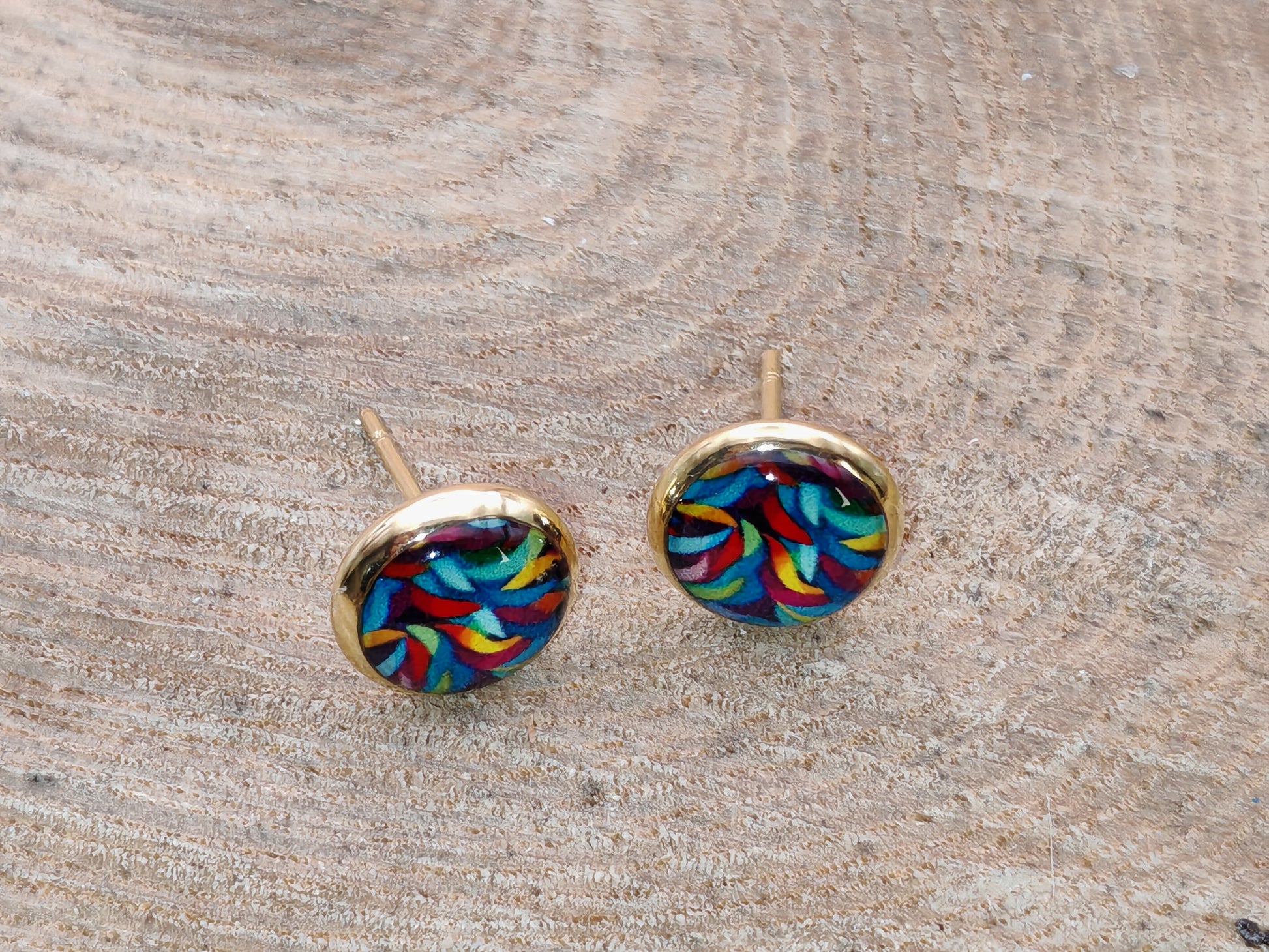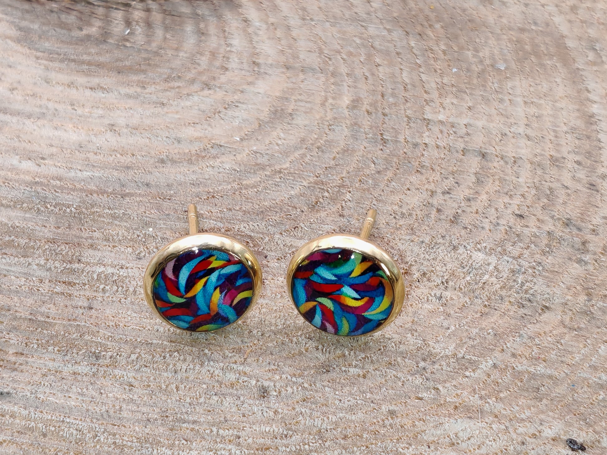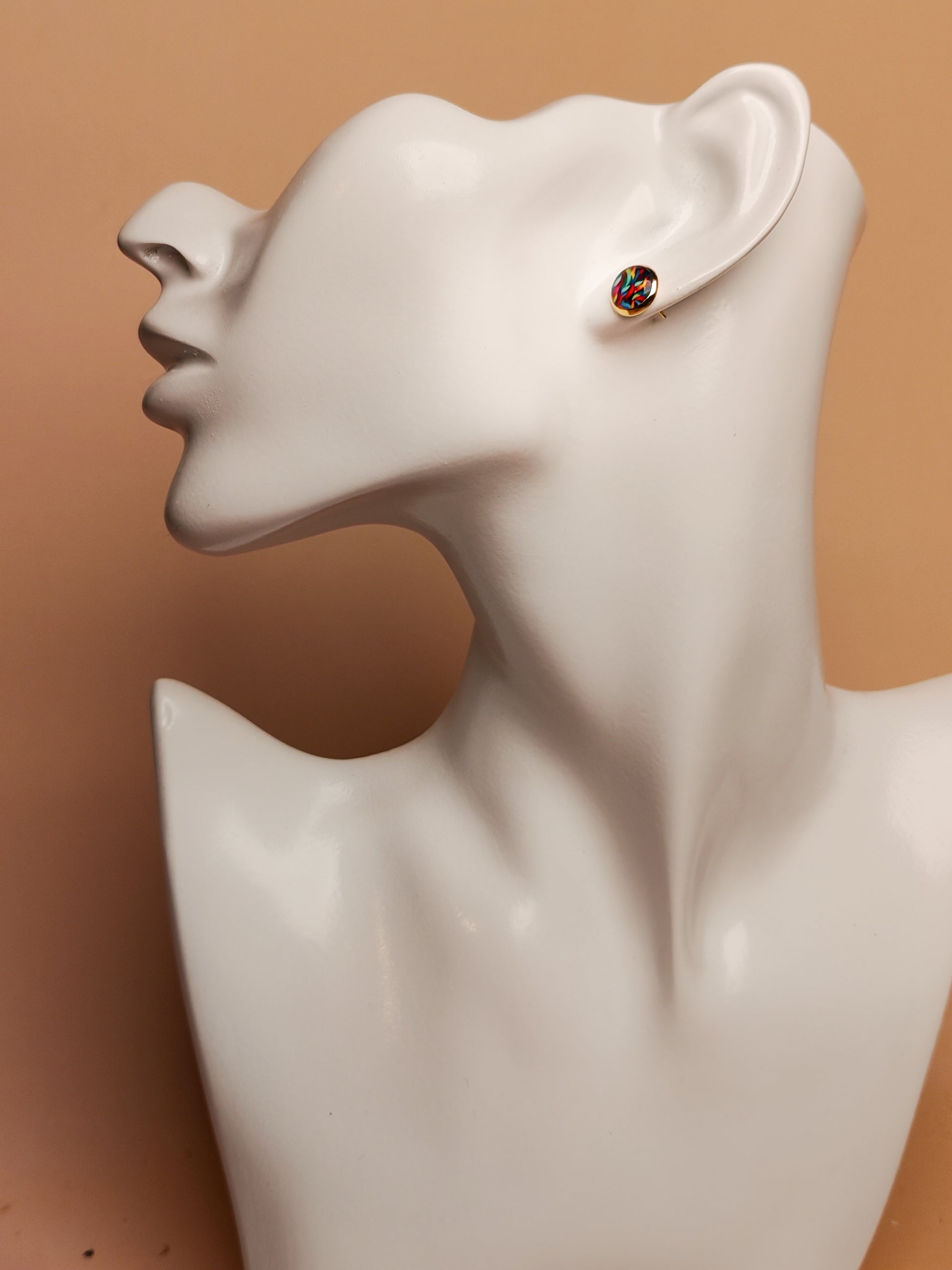 Ces clous d’oreille faits à la main se distinguent par un cabochon de 8 mm de diamètre aux couleurs vives et entremêlées, évoquant un mouvement en spirale joyeux et dynamique. Les nuances de bleu, turquoise, jaune, rouge et violet s’enroulent les unes autour des autres, créant un motif lumineux et plein d’énergie.