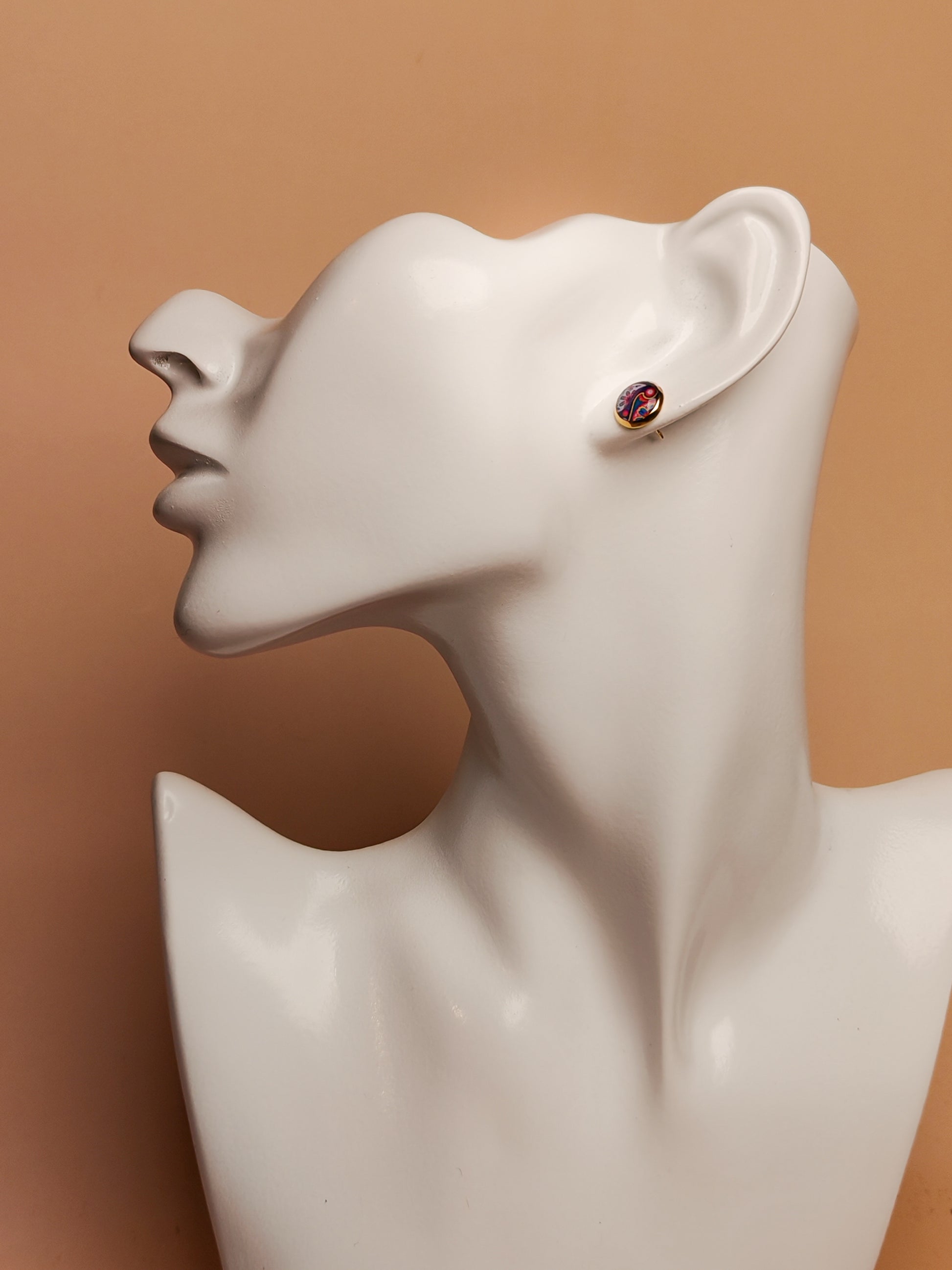 Ces clous d’oreille faits à la main se composent d’un cabochon de 8 mm de diamètre orné de motifs paisley expressifs et colorés. Les formes ondulantes mêlent des nuances de bleu profond, turquoise, rose, rouge et touches dorées, créant un ensemble riche, chaleureux et plein de caractère.