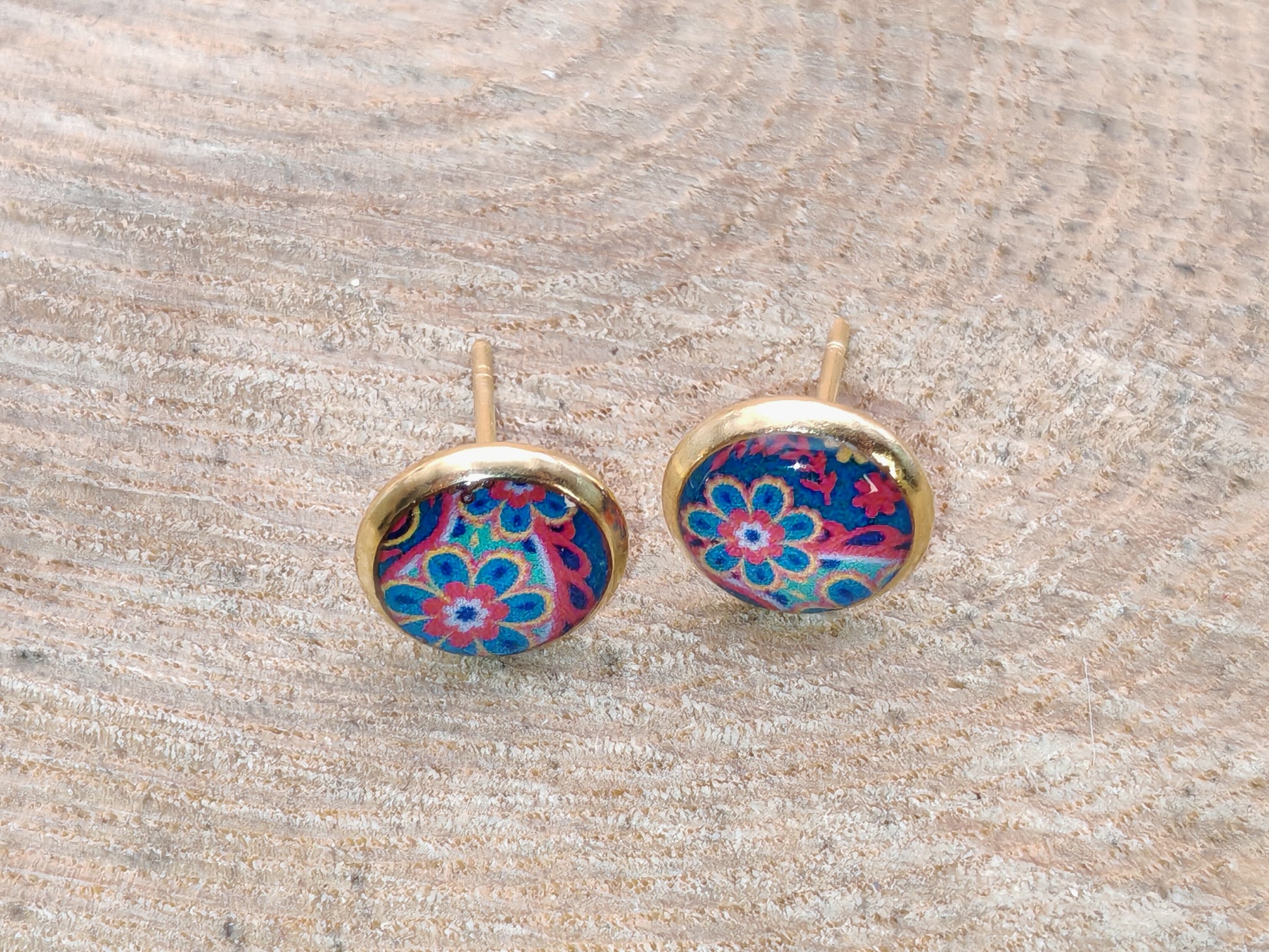 Ces clous d’oreille sont faits à la main et composés d’un cabochon de 8 mm de diamètre, monté sur une base en acier inoxydable doré.