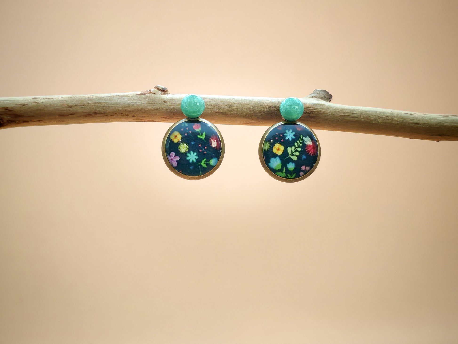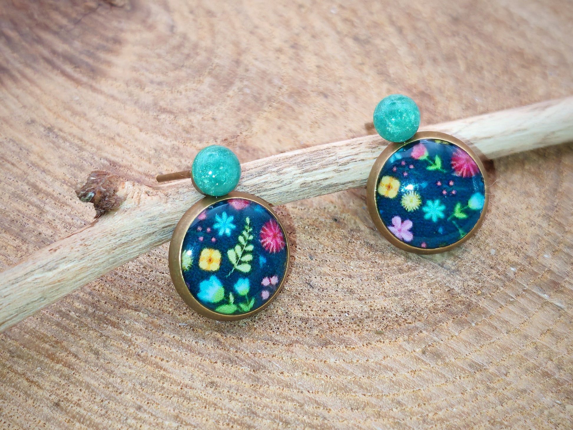 Le clou, de 4 mm de diamètre, est recouvert à la main d’une résine vert d’eau aux reflets doux et nacrés. Il soutient un cabochon de 10 mm orné d’un motif floral éclatant sur fond bleu nuit : de petites fleurs roses, jaunes, blanches, bleues et vertes y apparaissent comme des étoiles végétales dans l’ombre.