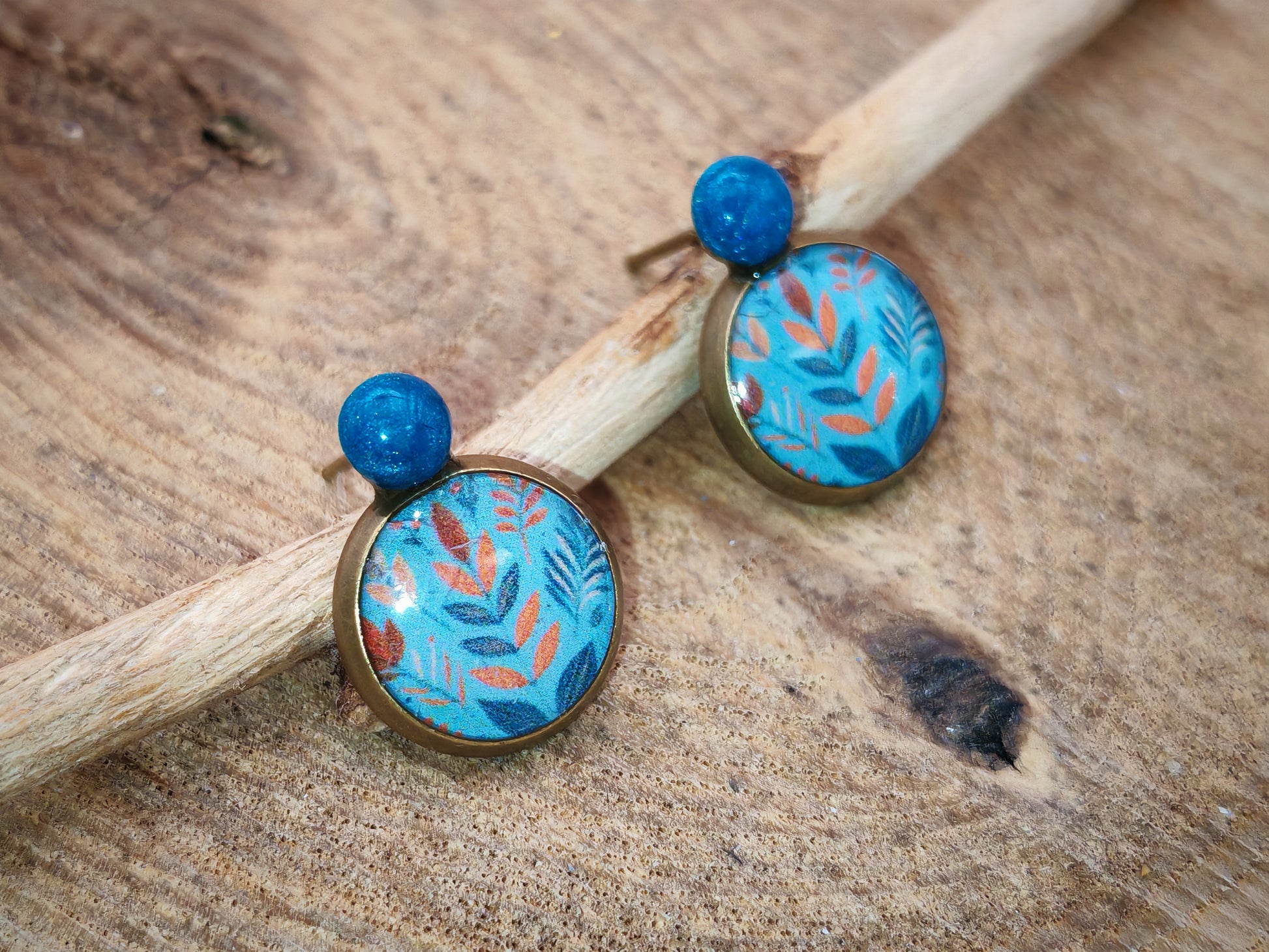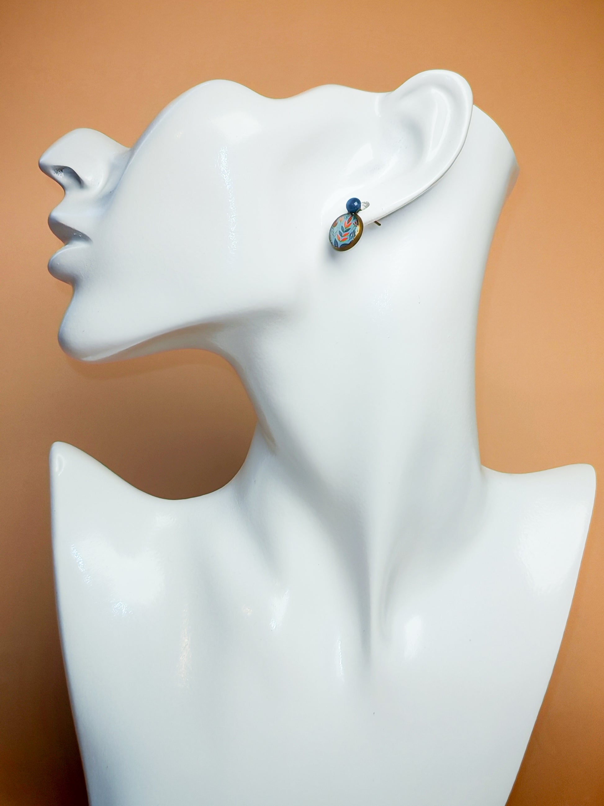 Le clou, de 4 mm de diamètre, est recouvert à la main d’une résine bleu clair pigmentée aux reflets nacrés. Il soutient un cabochon de 10 mm orné d’un motif de feuillages géométriques rouges et bleus, ponctués de petites touches orangées, sur un fond turquoise lumineux et texturé.
