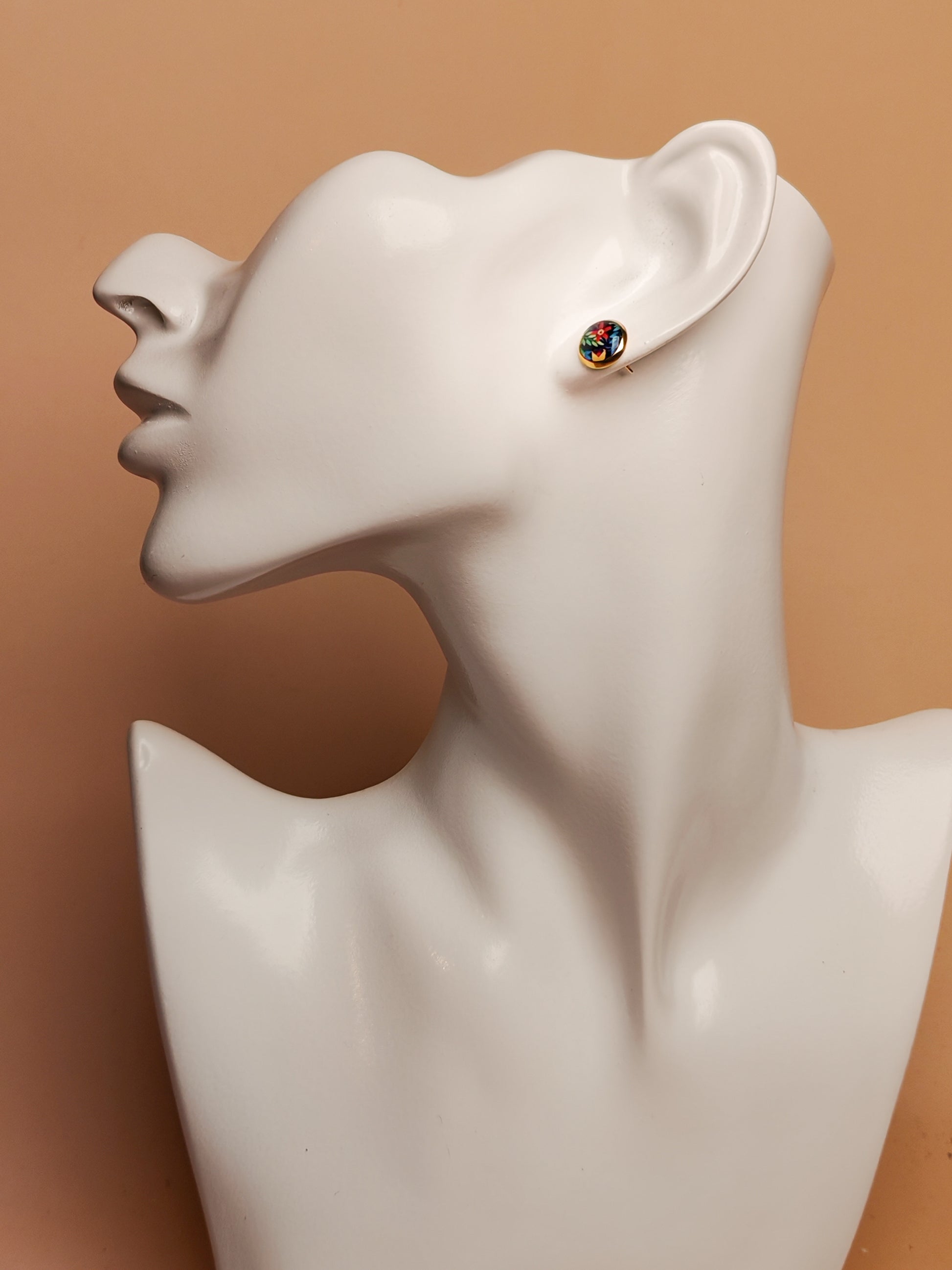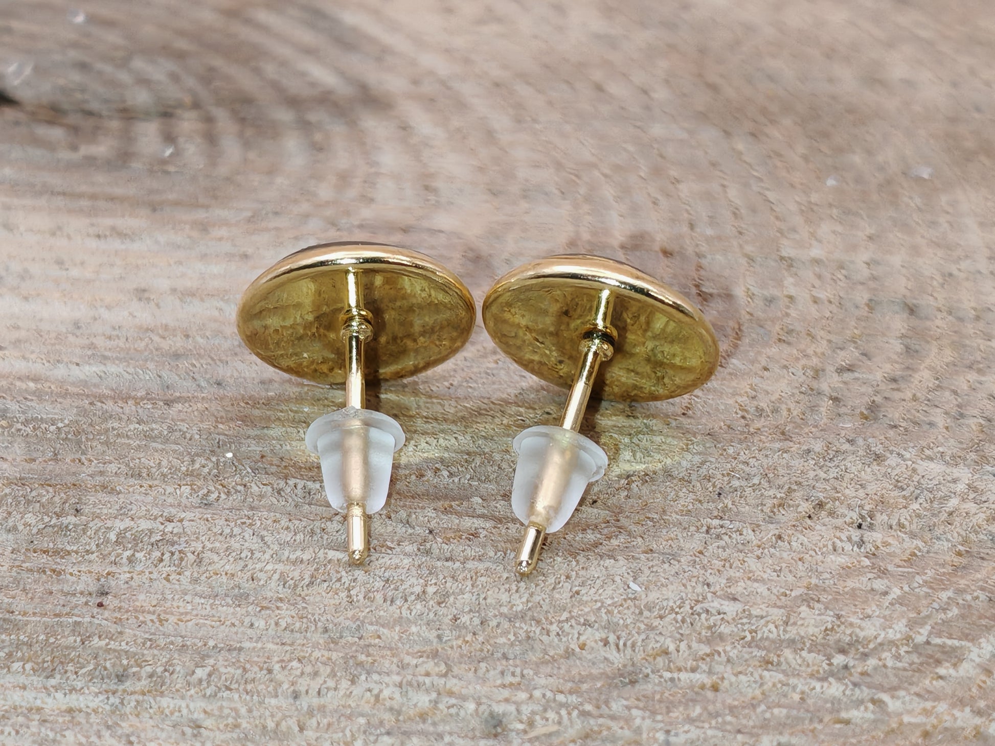 Ces clous d’oreille faits à la main sont composés d’un cabochon de 8 mm de diamètre, monté sur une base en acier inoxydable doré.