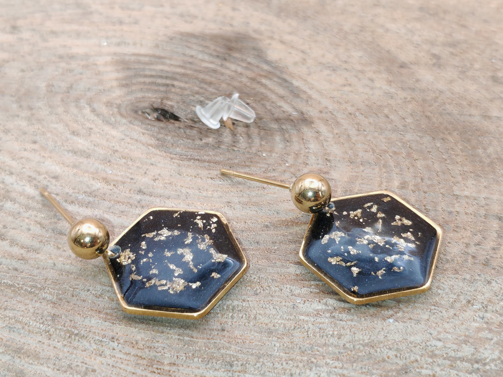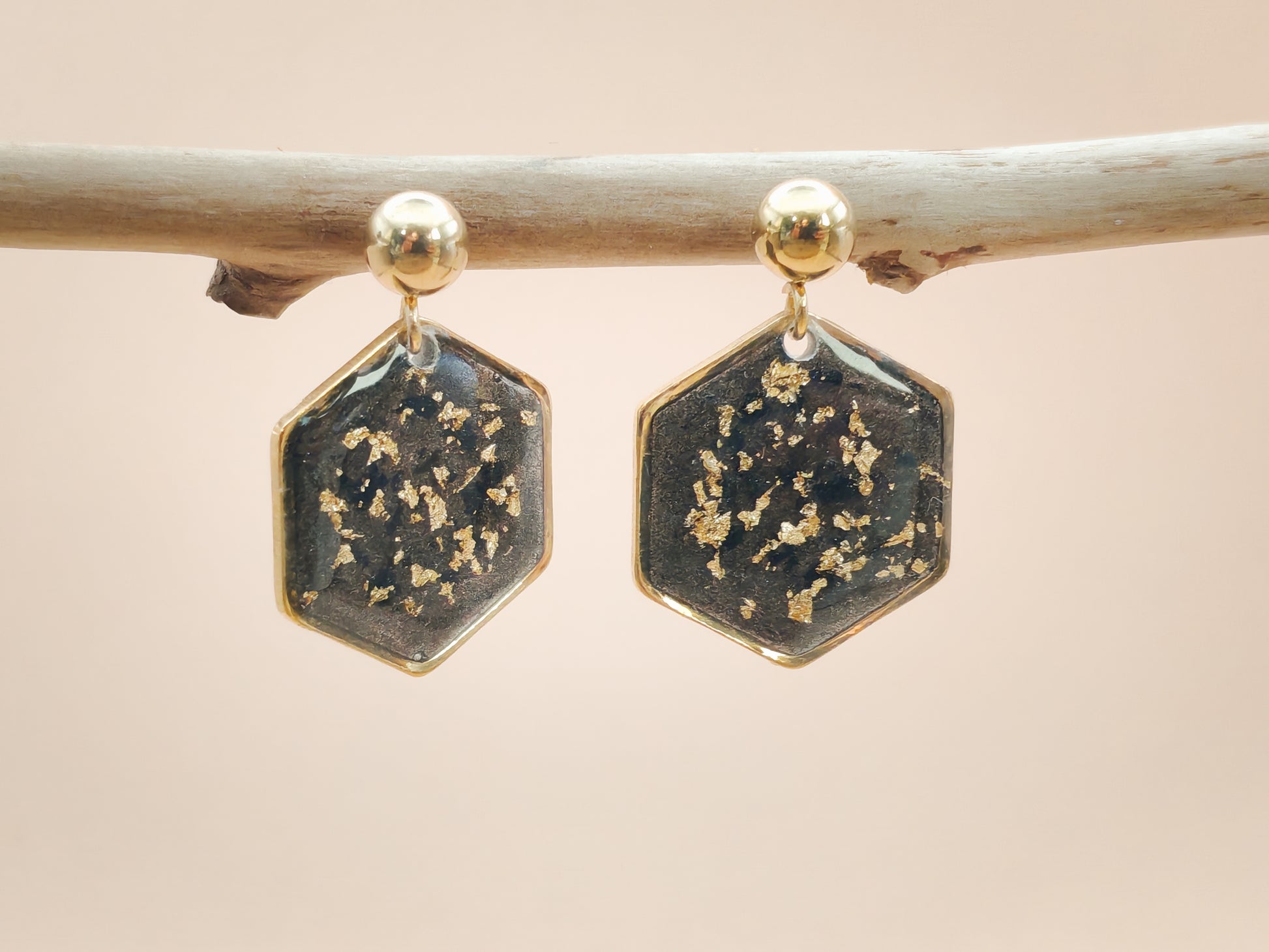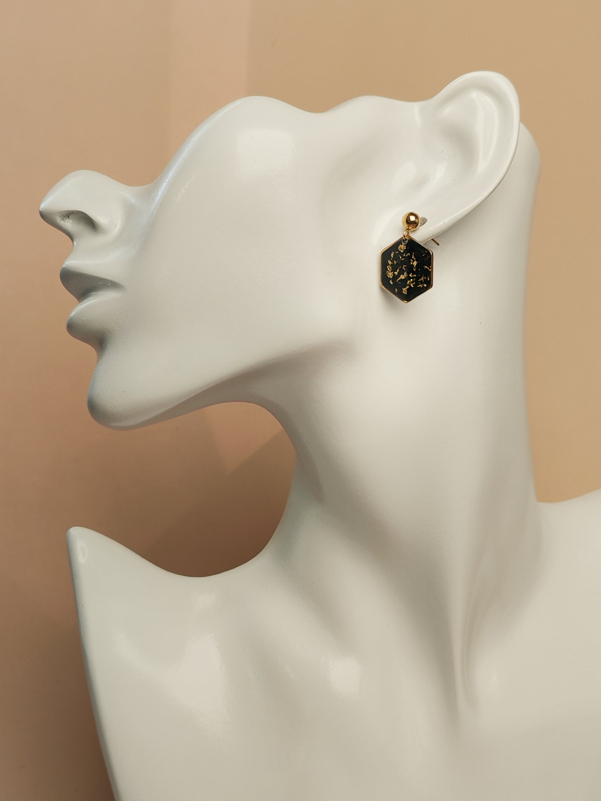 Ces boucles d’oreilles dévoilent un noir profond et lumineux, ponctué de délicats éclats dorés qui captent la lumière avec finesse. Le motif hexagonal, d’environ 1,5 cm de large, est recouvert de résine pour une finition lisse et brillante.