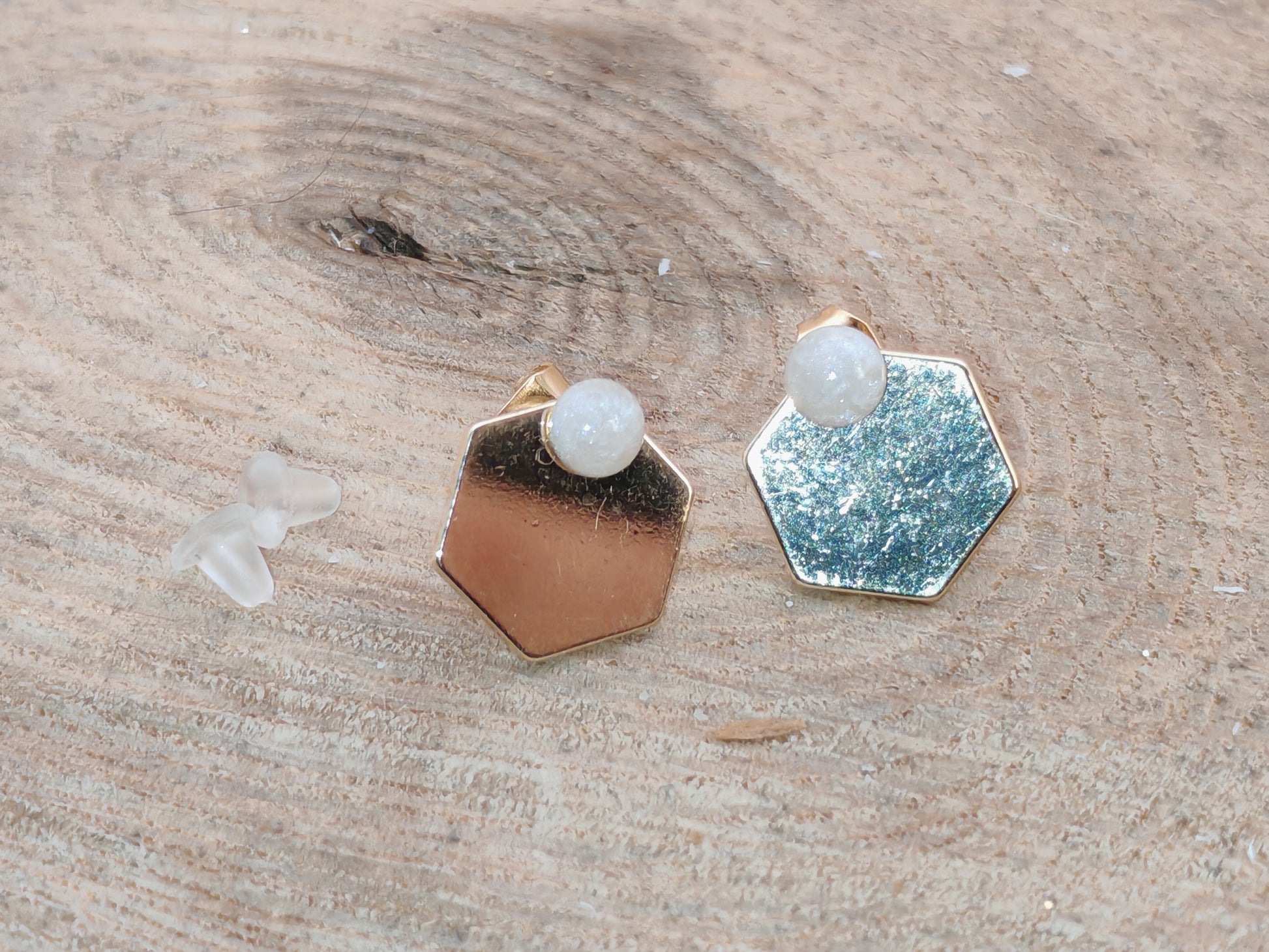 L’hexagone présente une largeur d’environ 1 cm, offrant un équilibre harmonieux entre présence visuelle et discrétion à l’oreille. Le contraste entre la surface lisse et lumineuse de la résine et l’éclat du métal crée un bijou minimaliste, facile à porter au quotidien comme lors d’occasions plus habillées.