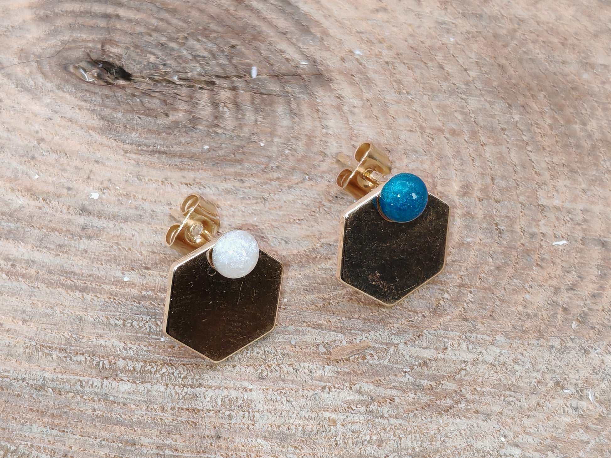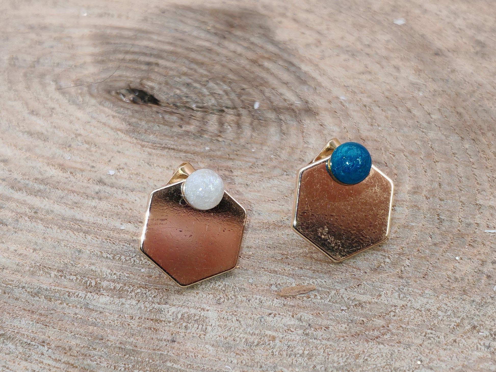 Ces clous d’oreilles associent une forme géométrique épurée à une touche de couleur subtile. Chaque paire est composée d’un clou recouvert de résine, délicatement bombé, associé à un hexagone doré qui structure l’ensemble avec élégance.