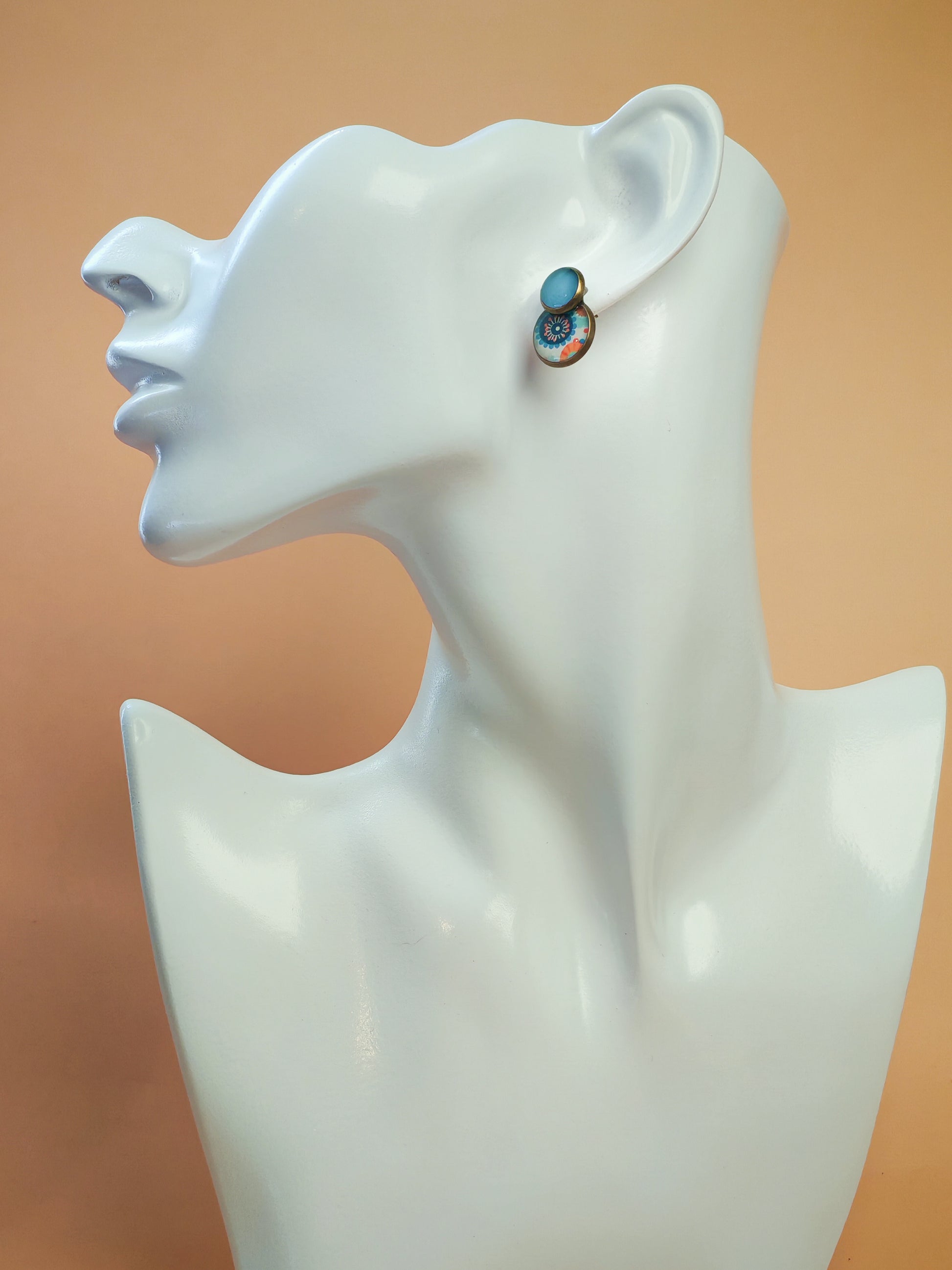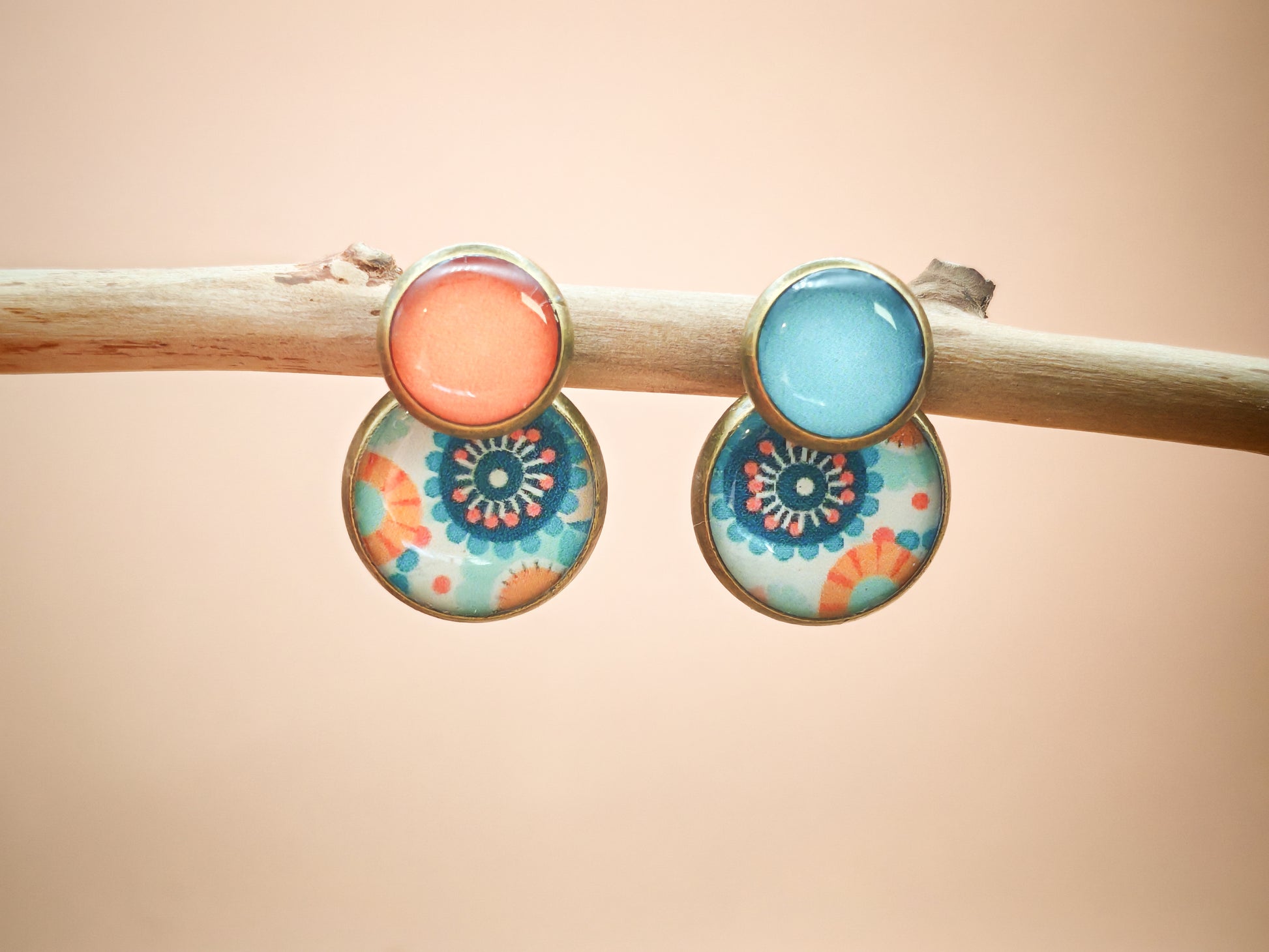 Ces boucles d’oreilles originales en métal couleur bronze, soigneusement faites à la main, associent deux cabochons – un de 8 mm et un de 12 mm – délicatement reliés par de la résine. Le cabochon supérieur, plein d’éclat, se décline en orange doux ou bleu vif selon le côté, tandis que le cabochon inférieur dévoile un motif mandala aux teintes ensoleillées sur fond clair.