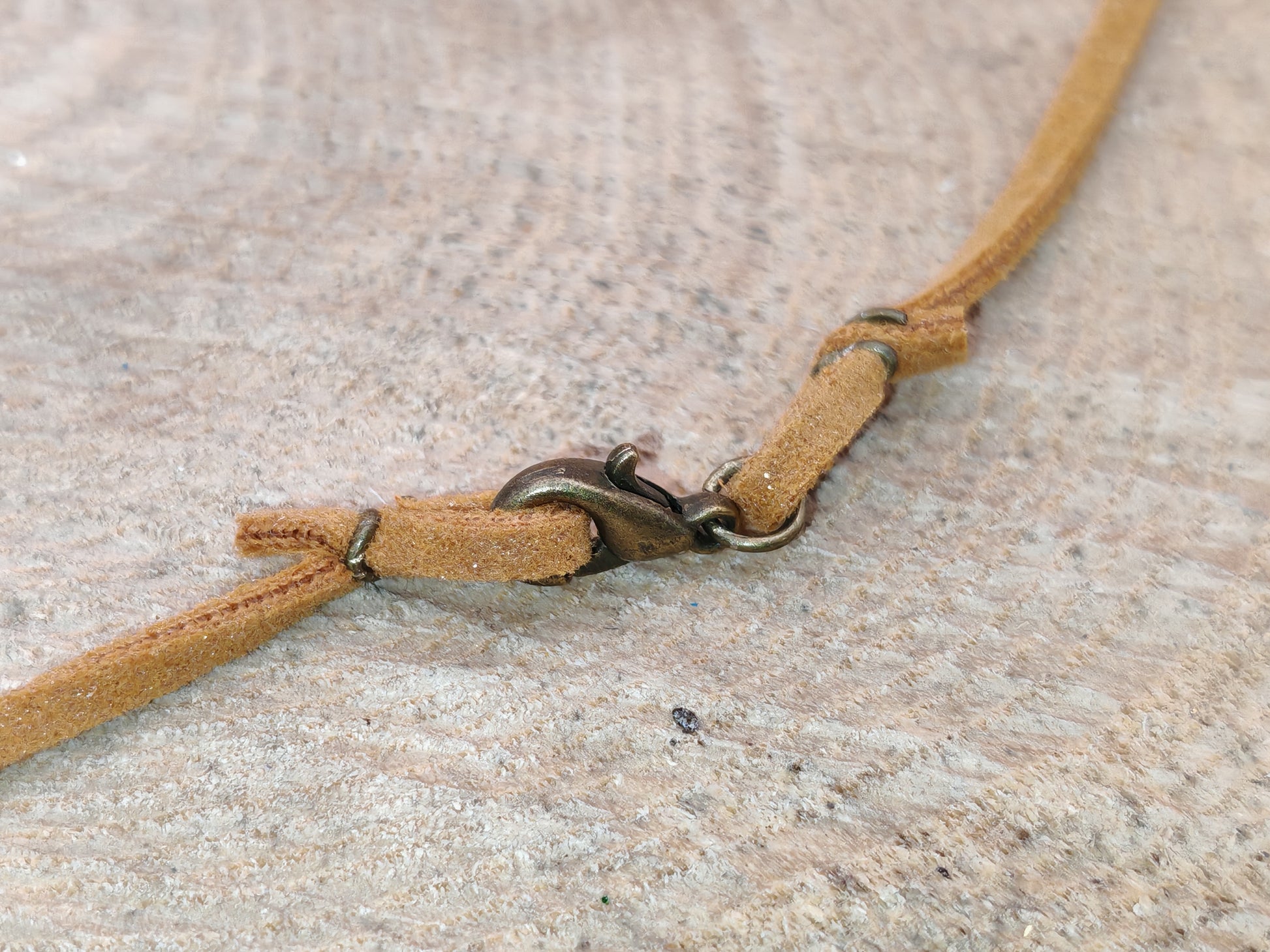 Le pendentif est monté sur un cordon suédine, tandis que les boucles d’oreilles sont suspendues à des crochets en métal de couleur bronze, apportant une touche chaleureuse et harmonieuse à l’ensemble.